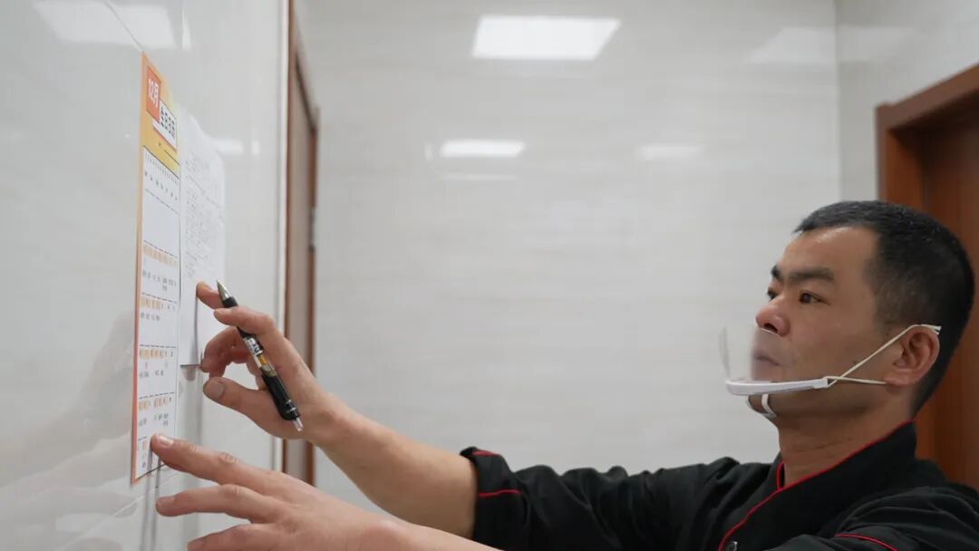 莫师傅的案板台前,贴着一张值班表,他会根据每天的值班情况来调整烧菜次数和搭配。