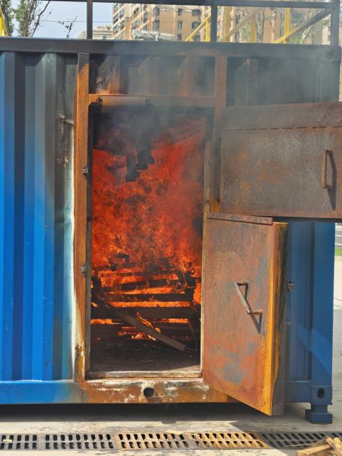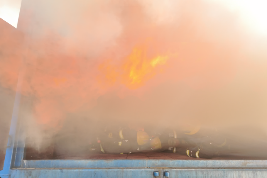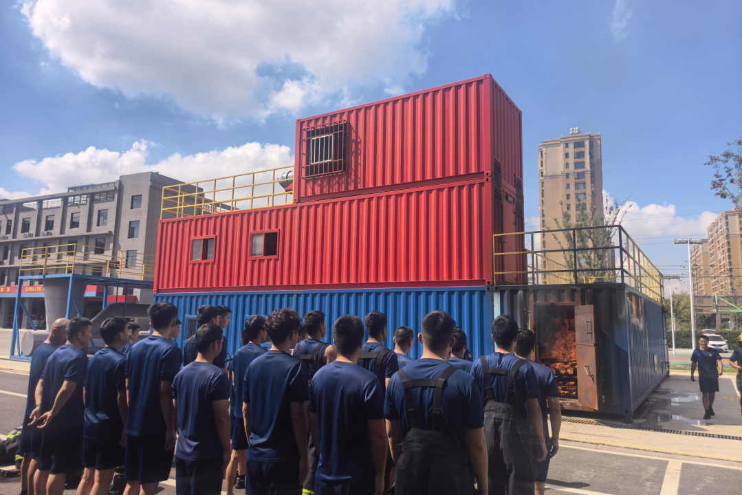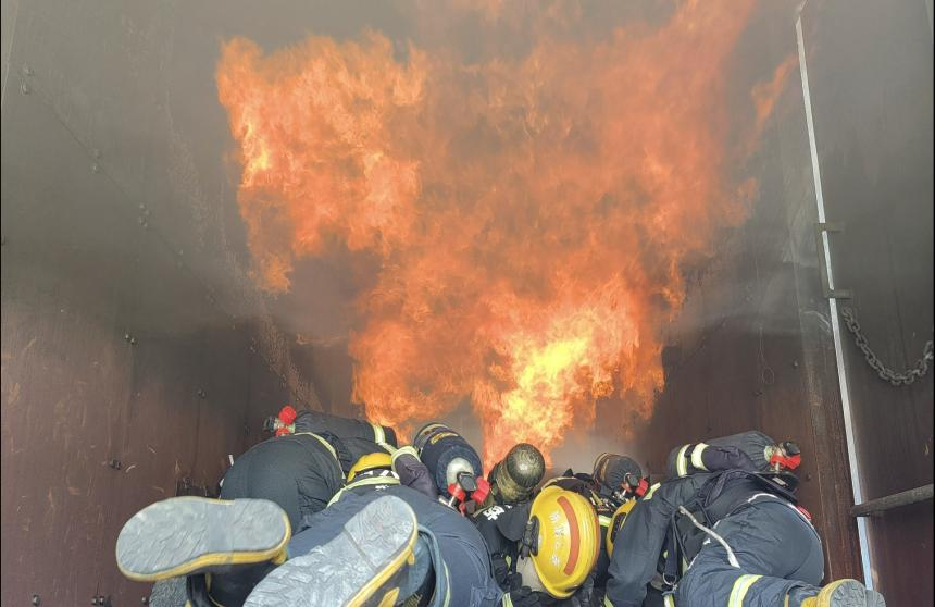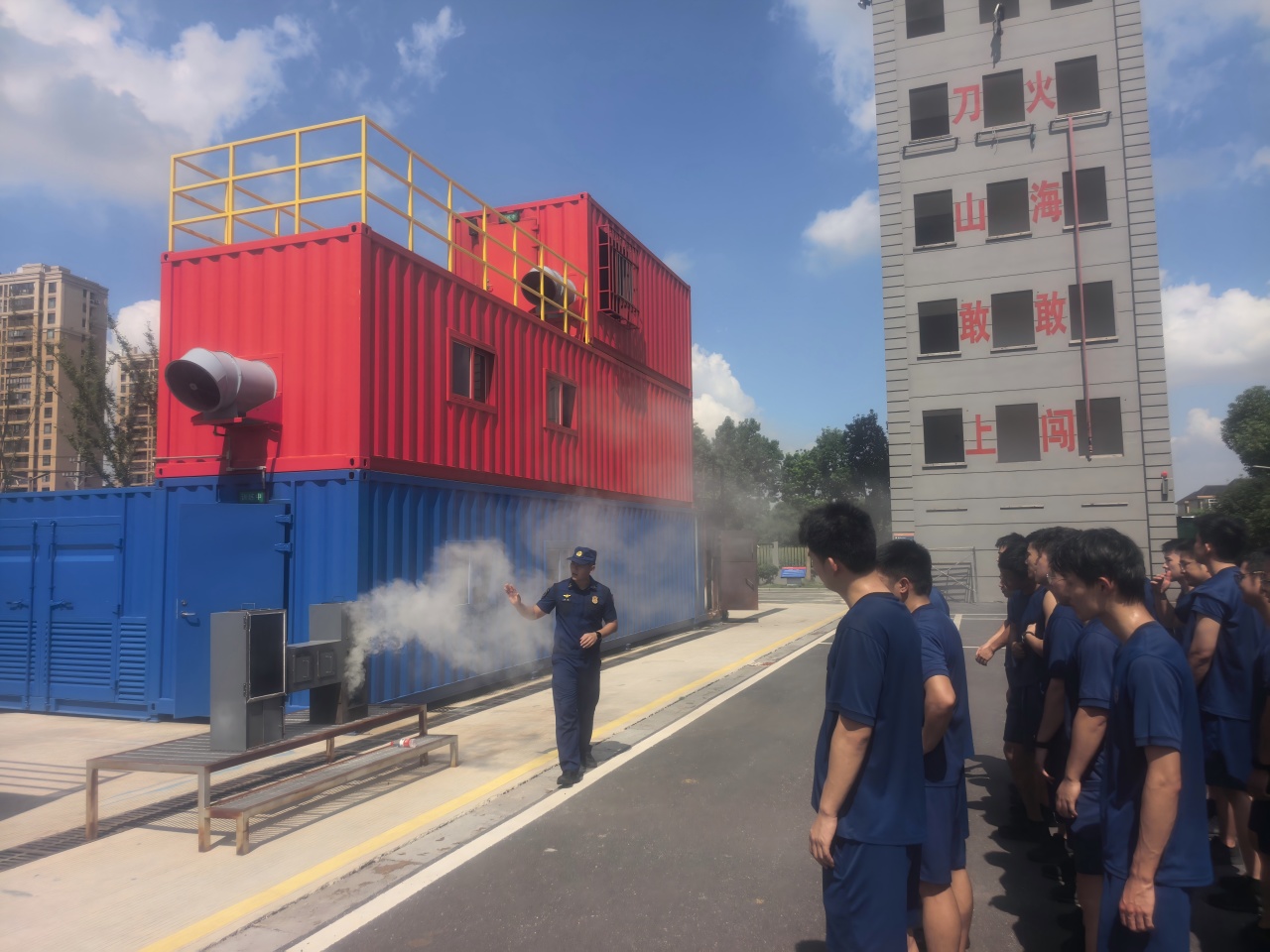 训练过程中,依托“真烟真火训练设施”,教练员组织参训队员穿戴好个人防护装备后,低姿进入燃烧柜,体验不同阶段的高温炙烤,直观感受烟火和中性面发展变化以及回燃、轰然、滚然现象的发生。