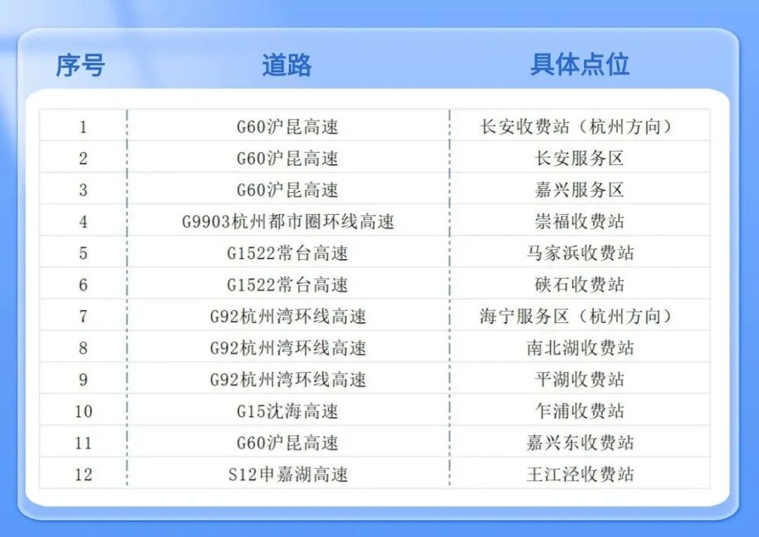 温馨提示:以下收费站、服务区设置事故快处点,并为群众提供咨询答疑、路线指引、交通安全宣传、应急服务等暖心服务。