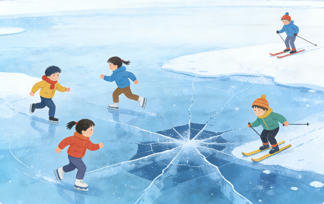 不要让孩子在没有安全保障的冰面上行走、奔跑、玩耍或进行冰上运动,如滑冰、滑雪等。