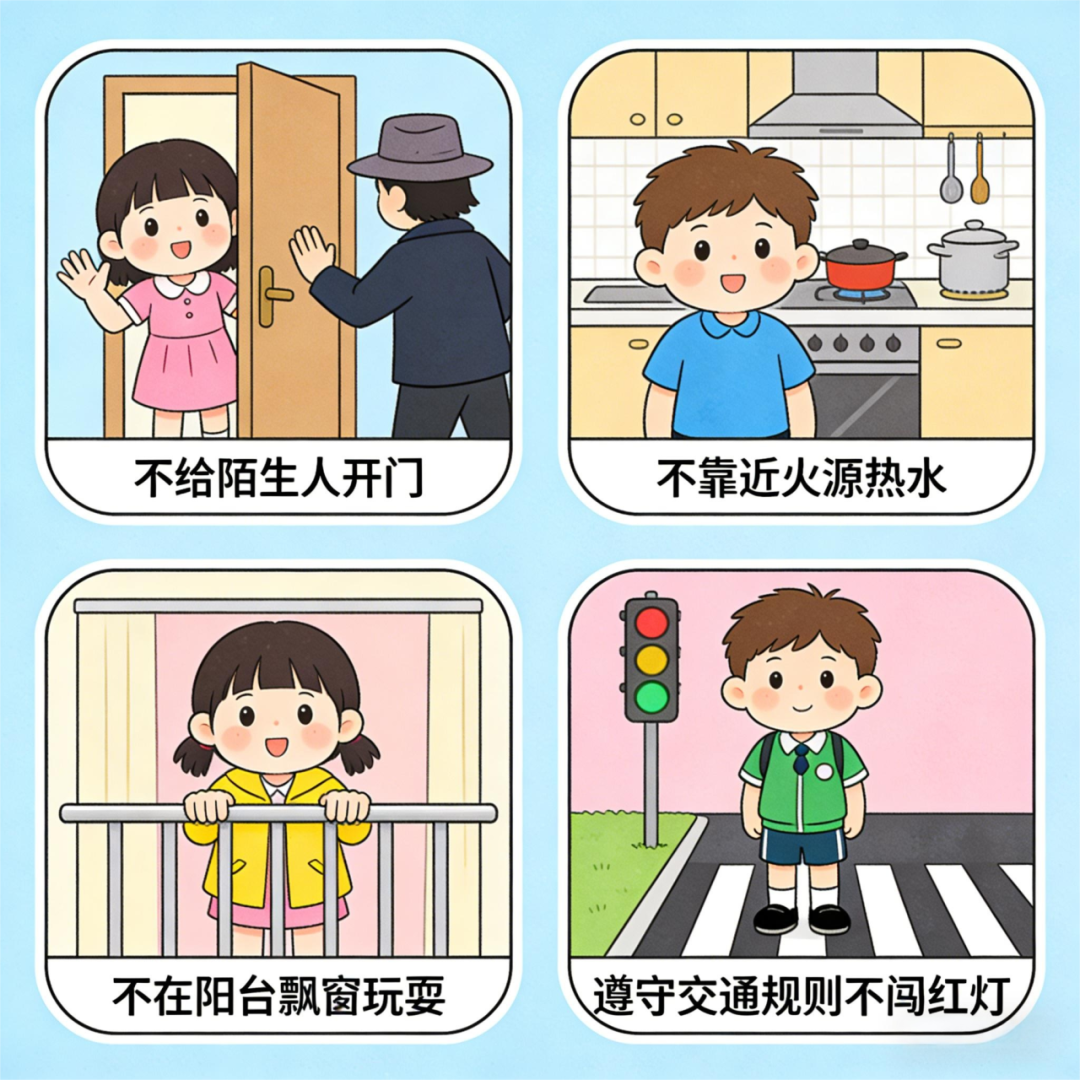 要时常对孩子进行安全教育,不给陌生人开门,不要靠近火源、热水等,以防烫伤。不在阳台或飘窗玩耍,不在河边、水塘等区域玩耍,遵守交通法规,不闯红灯。家长要明确告诉孩子哪些事情很危险,是不能做的事情。