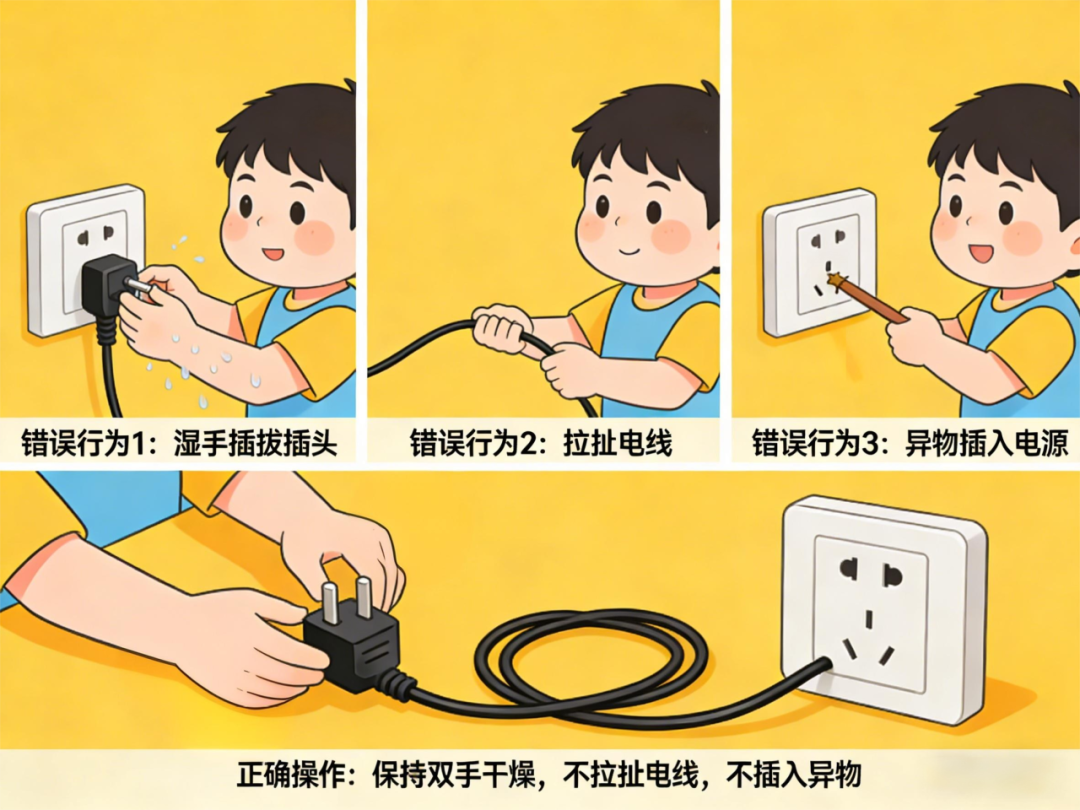 碰触电器、电源开关、插拔插头时一定要保持双手干燥,不要拉扯电线,不要好奇把手或棍棒插入电源。