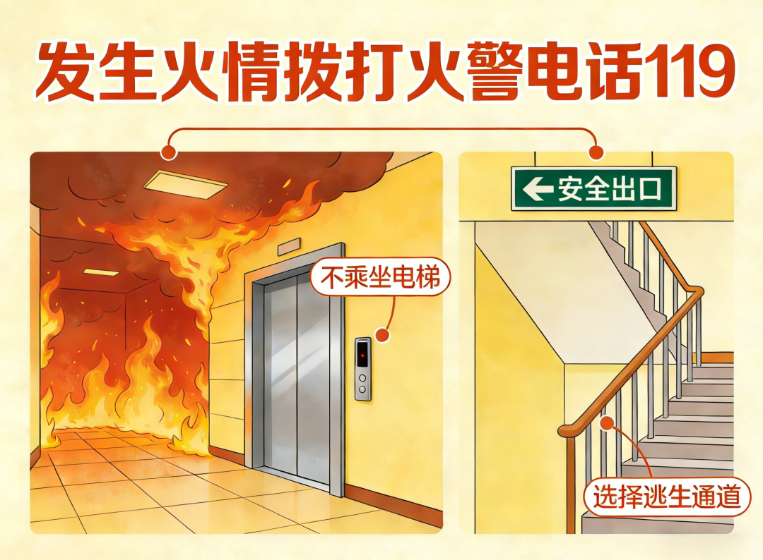 教会孩子如发生火情,迅速拨打火警电话“119”,讲明详细地址、起火部位、着火物质、火势大小、留下姓名及电话号码。告知孩子一旦发生火灾,千万不要乘坐电梯,安全出口和楼梯才是正确的选择。