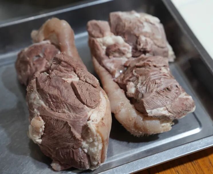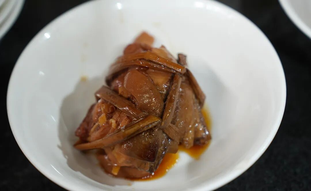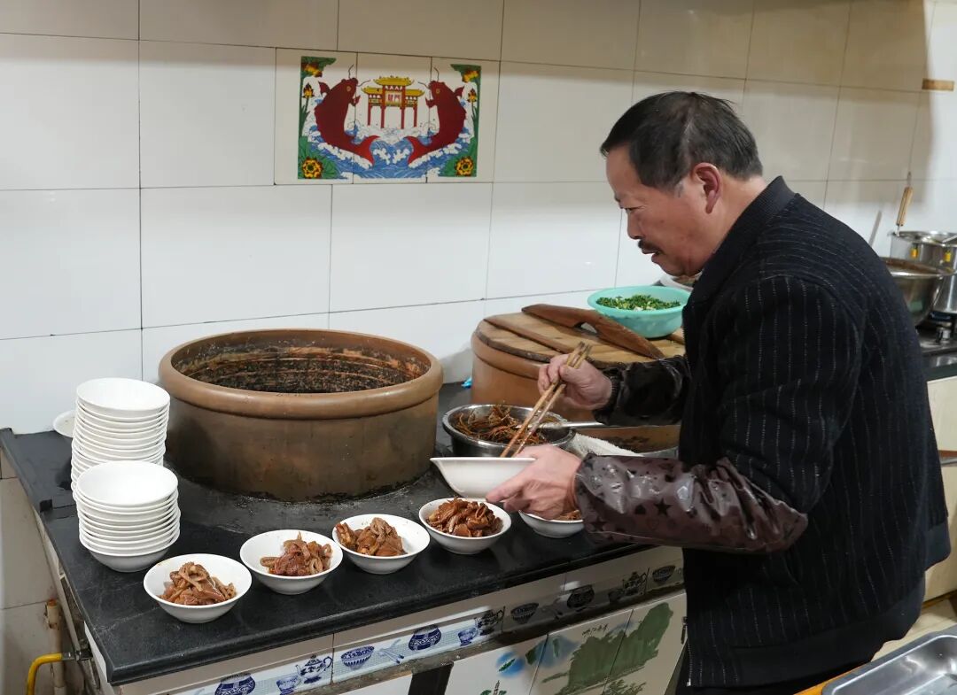 除了招牌红烧,白切羊肉也是镇店之宝。蒸煮得当的羊肉被片得厚薄均匀,蘸上特调酱汁,入口鲜香满溢。“我们王店人办酒席,桌上总少不了一盘白切羊肉。”苏金林语气里带着自豪,“现在外面都是红烧羊肉多,做白切的,确实越来越少了,不少人家都是提前来我家订。”