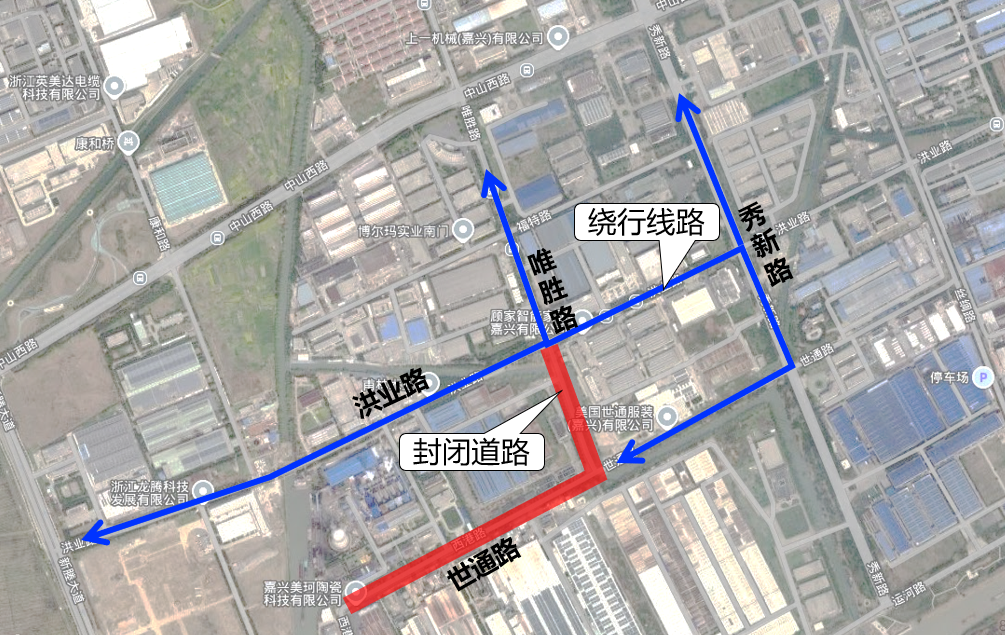 请过往车辆合理调整出行线路,选择洪业路、秀新路、世通路等道路进行绕行。