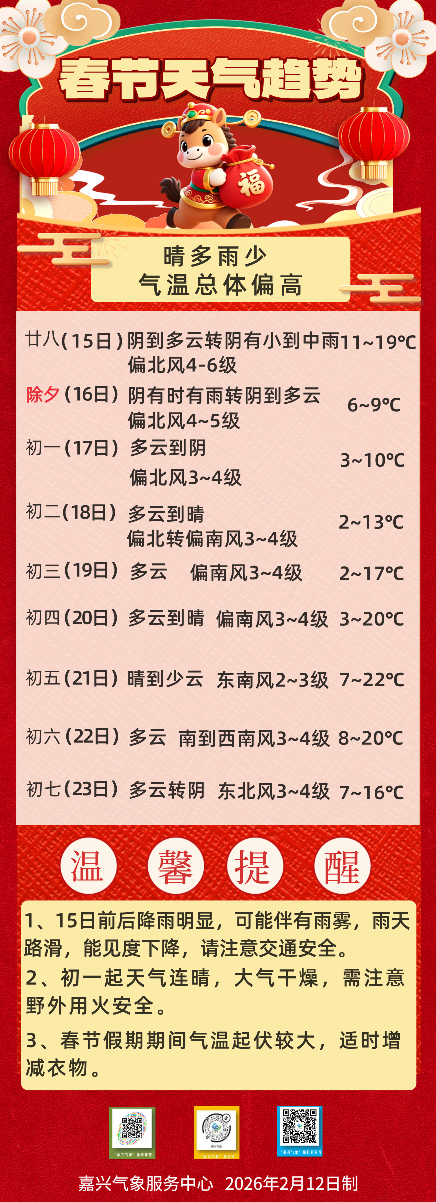 春节假期禾城先湿冷后晴暖,气温起伏明显,请及时关注最新的天气信息,以免对假期出行及走亲访友造成不便。