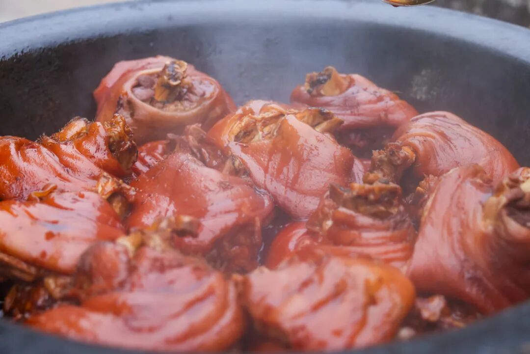 “香迷糊了!”在新塍镇天福村里,大锅支起,柴火噼啪,浓油赤酱的蹄髈在锅里翻滚,66岁的乡厨孙佰林手握长勺,翻动着一锅红烧蹄髈,汤汁渐稠,色泽红亮。