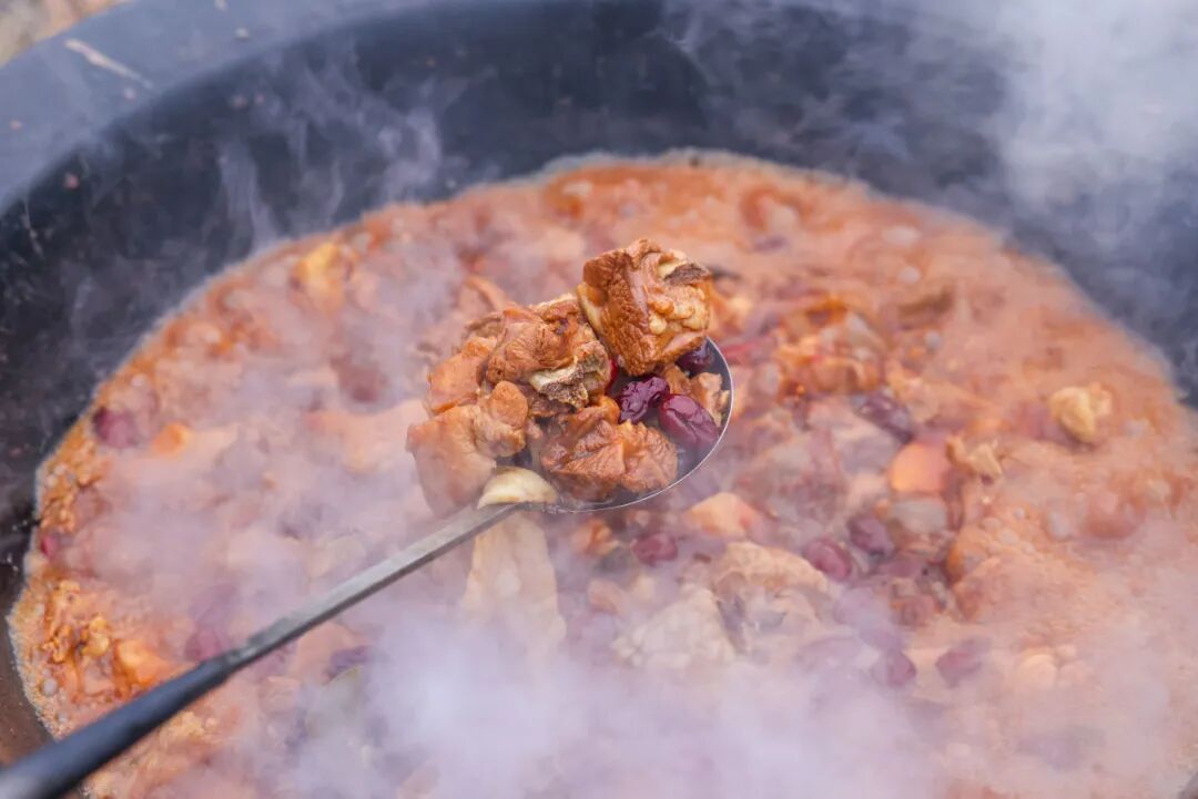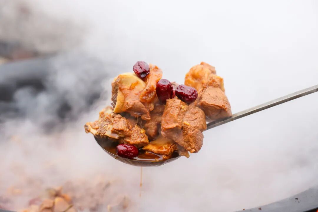 一旁的红烧羊肉,又是另一重工夫。土灶柴火烧得正旺,大块带皮羊肉在锅里翻滚,酱色渐浓,油亮如漆。孙佰林掀开锅盖,热气裹着香料味扑了满脸。