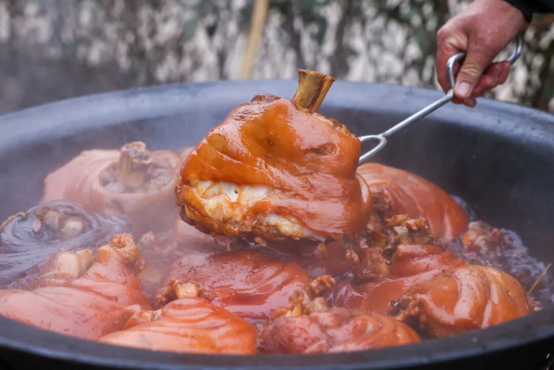 4个多小时的慢煨,柴火的热力从锅底一点点透进骨子里。蹄髈在酱色浓汤里咕嘟着,渐渐酥透,筷子探下去,不消用力,皮肉便顺从地分开,嚼来满口咸香回甘。