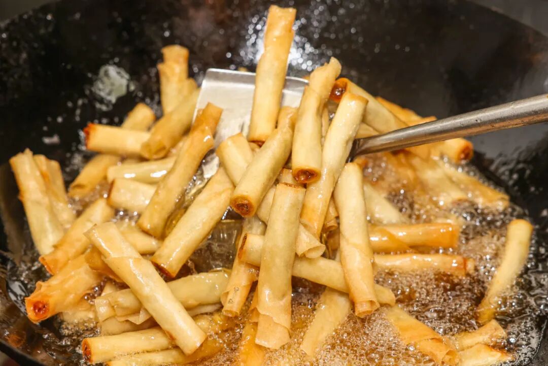 除了硬菜,春卷便是席上地道的“小孩菜”,金黄酥脆,一口咬开便是滚烫绵密的豆沙馅。
