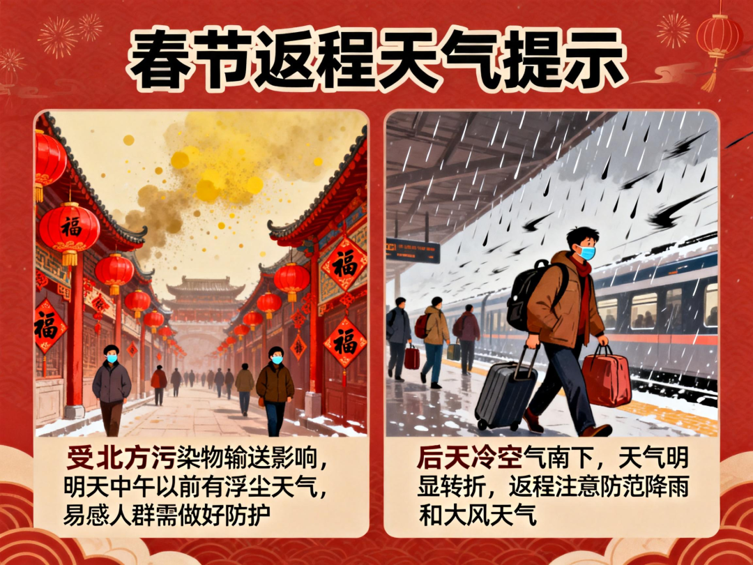 气象部门提醒,正值春运返程高峰,雨雪天气将对交通出行较为不利,建议公众关注临近预报预警信息,合理安排出行计划,注意交通安全。