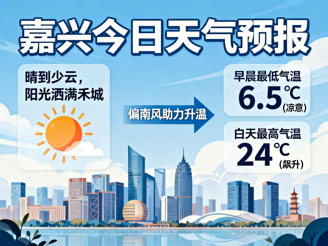 根据市气象台的最新监测数据,今天嘉兴晴到少云,阳光将毫无保留地洒满禾城 。早晨最低气温起步于6.5℃,虽然还有点凉意,但在强劲的偏南风吹拂下,白天最高气温预计将飙升至惊人的 24℃!