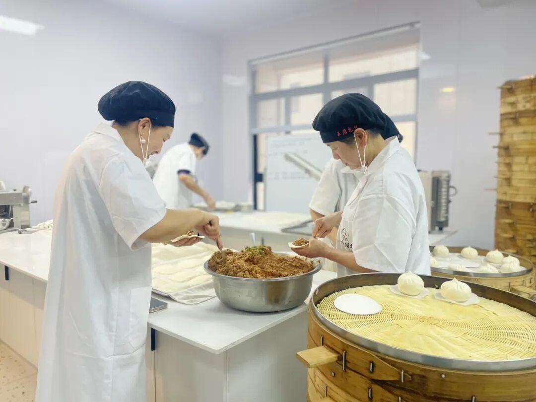 每天从早上3点起,二楼操作间就是一派热火朝天的景象。和面、擀皮、制馅、包包子、预热蒸箱……工人师傅分工明确、手脚麻利。