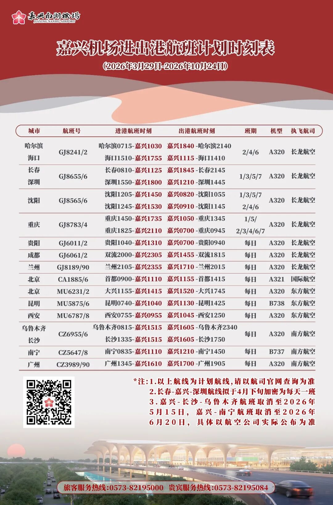 因航空公司运力调整,接中国南方航空正式通知,嘉兴=长沙=乌鲁木齐航线取消至2026年5月15日,嘉兴=南宁航线取消至2026年6月20日。此次调整给您的出行安排带来不便,我们深表歉意,敬请谅解!
