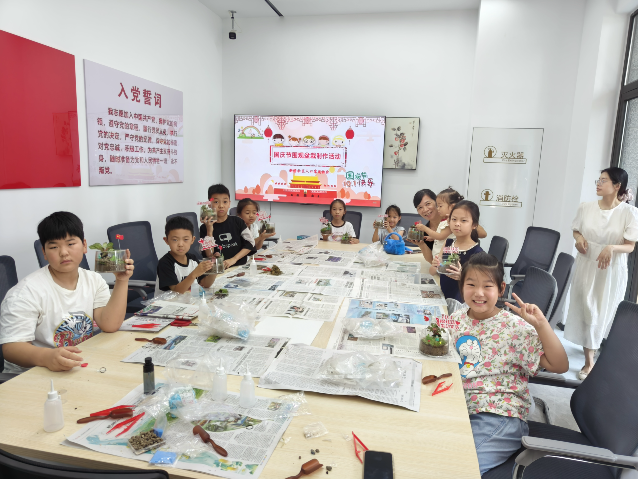 新桥社区党群服务中心举办了“我为祖国添点绿”盆栽DIY手工活动。活动中,小朋友们化身“小小园艺家”,在欢声笑语中挑选心仪植物,将绿意装入玻璃杯,一个个精致鲜活的盆栽作品相继诞生。孩子们用指尖绿意为祖国华诞送上美好祝福,收获满满快乐与成长。