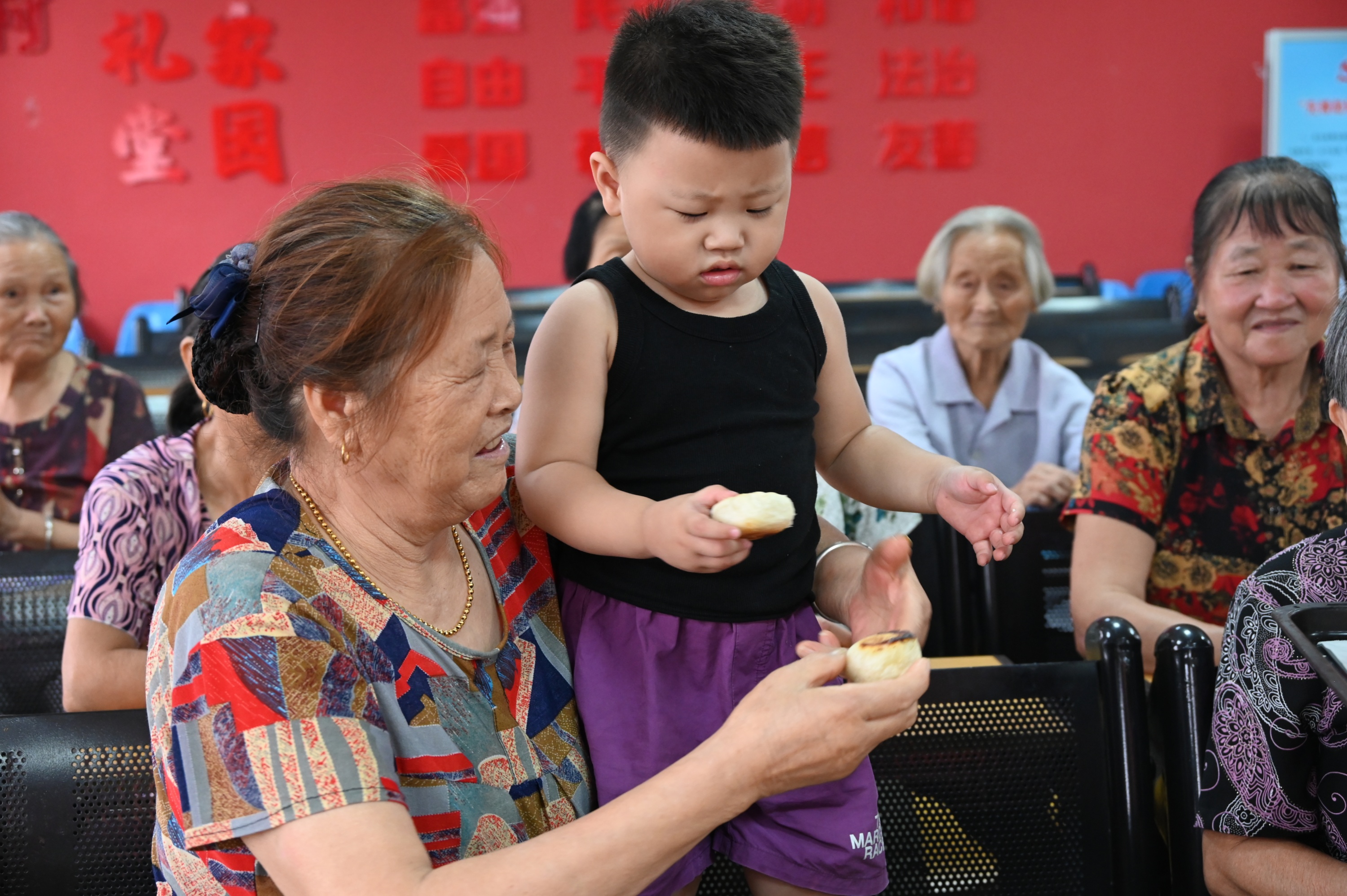 现场,老人孩子齐动手做月饼、制花灯,庆祝中秋、国庆。老人们耐心教孩子揉面包馅,孩子们创意制作并将第一块月饼递给老人。现场花灯亮起,童声朗诵挥旗表演,老幼同乐,温情洋溢。