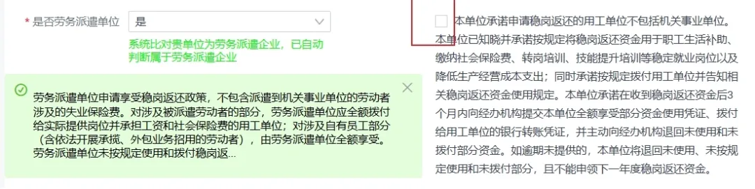 1、劳务派遣单位向参保地经办机构提出稳岗返还申请时,网上申报步骤同上。“是否劳务派遣单位”系统会自动比对,单位须二次确认,并勾选单位承诺须知信息,填写劳务派遣单位信息模块。