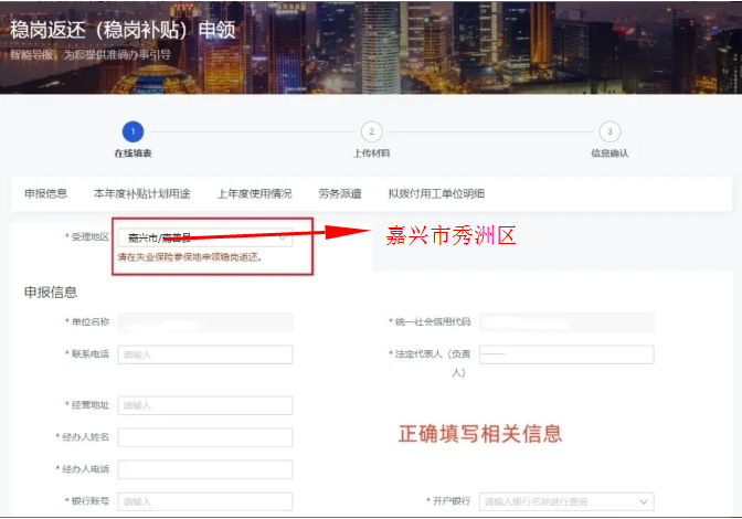 2、搜索“稳岗返还(稳岗补贴)申领”,点击“在线办理”,进入申报页面(受理地区选择:嘉兴市秀洲区)