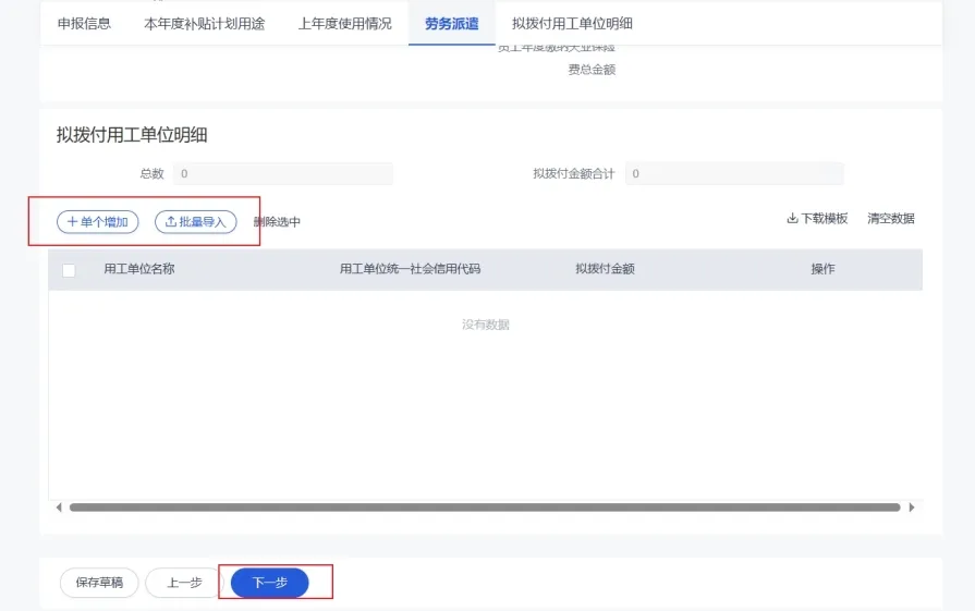 2、需单个增加或批量导入拟拨付用工单位信息明细。