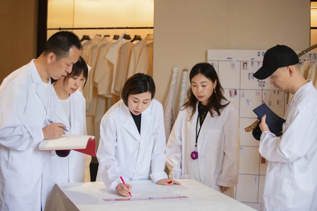 “衣服里有个人,得先尊重穿它的人。”这句话是张利华总挂在嘴边的。为了摸透衣服的“脾性”,她养成了试衣的习惯。特别是在大批量生产前,她都会亲自上阵,体验每件衣服在生活场景中可能发生的动作,比如不同高低的座椅、模拟开车、伏案办公等。一次试衣时,张利华发现在站着的时候很完美,但是当坐下时,衩开得就偏高了,不是很优雅。从此,“体感测试”成了张利华团队研发铁律,哪怕是最细微的褶皱、最隐蔽的分割,都逃不过她的“火眼金睛”。