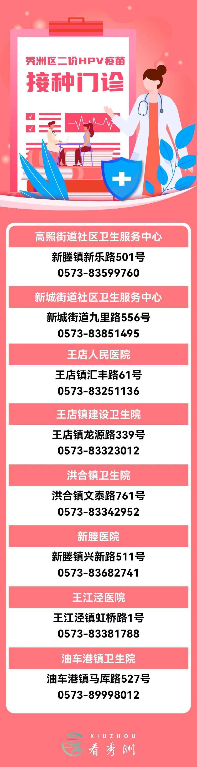 “目前,秀洲将开展适龄女生免费接种二价HPV疫苗意愿摸底调查。”区卫健局相关负责人提醒道,等摸底调查后为有意愿接种的适龄女生开展接种。