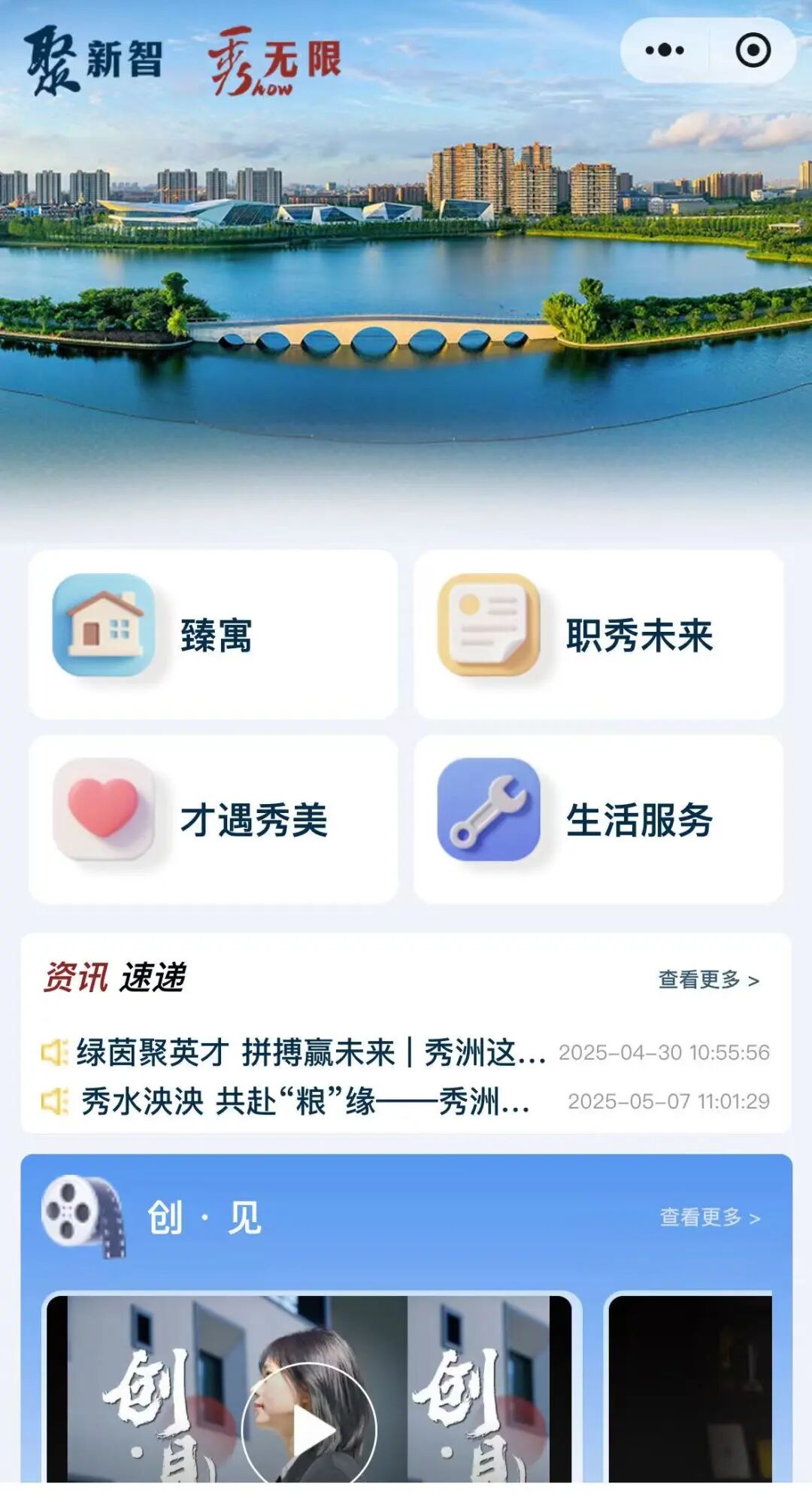 打开“科创人才服务”微信小程序可以看到,首页设置了“臻寓”“职秀未来”“才遇秀美”“生活服务”等四大功能板块,各类人才需求角度提供的各类资源。