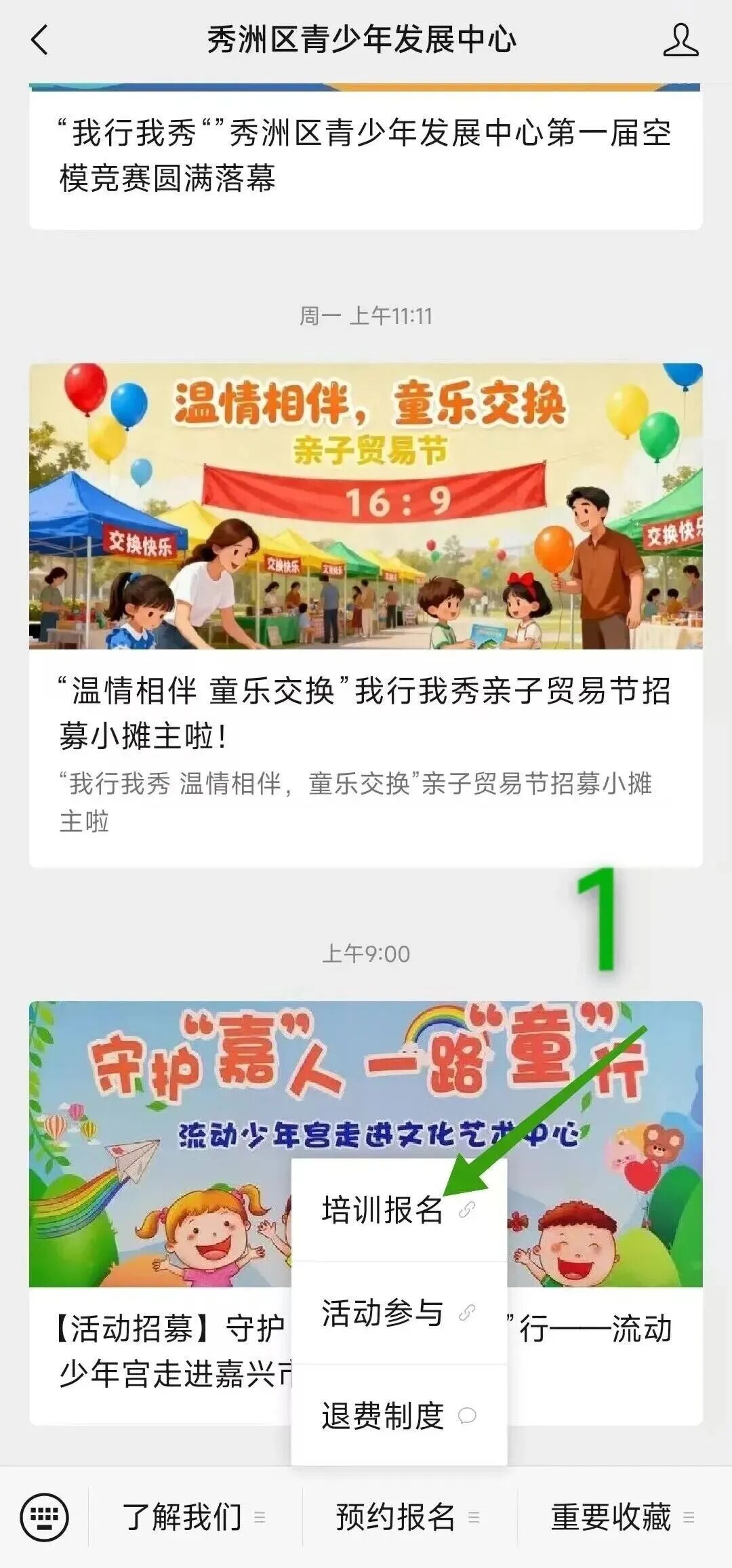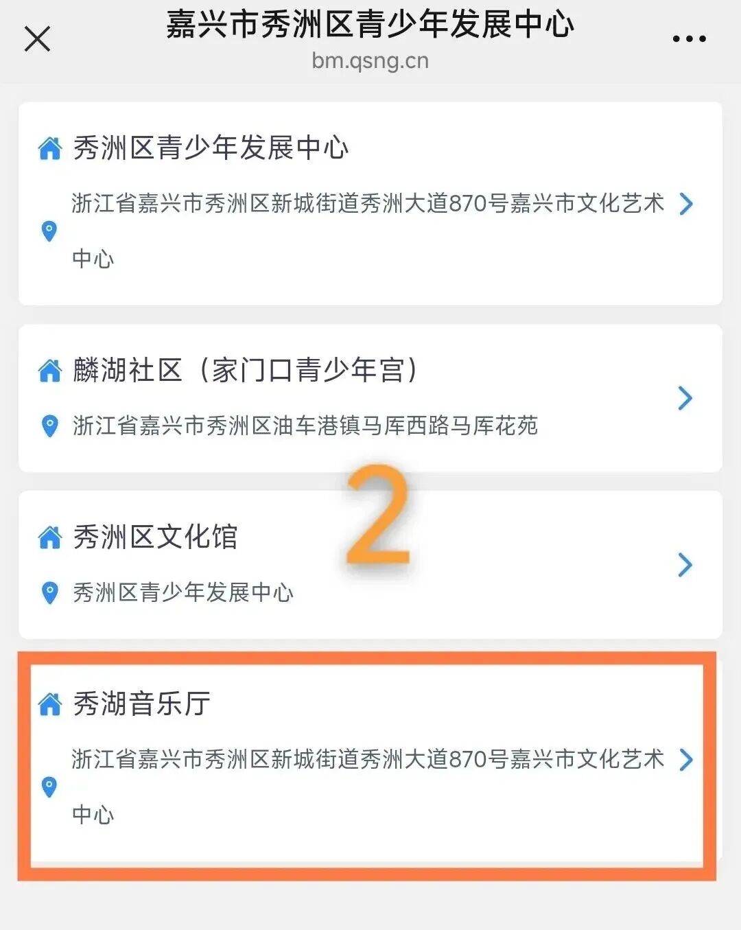 2、点击一预约报名一培训报名(未注册的请先用小朋友身份证注册再登录)—秀湖音乐厅。