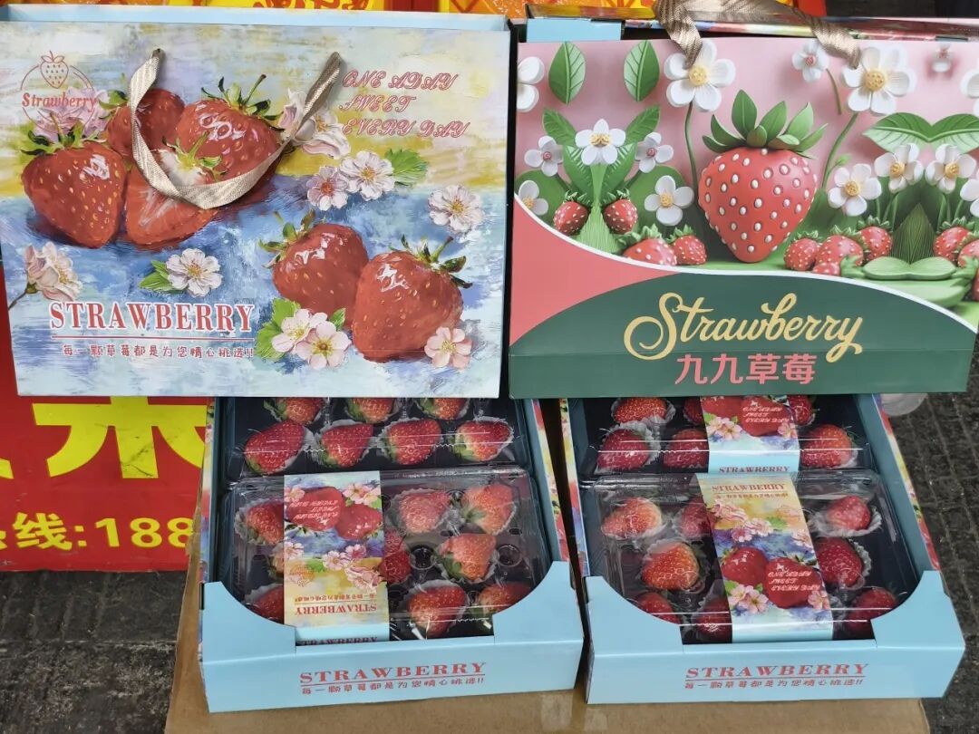 小编走访还发现,部分档口已经有礼盒装的草莓上市,泡沫箱加上网套单层的包装方式,不仅外观精美整洁,也更受高品质的消费者青睐。