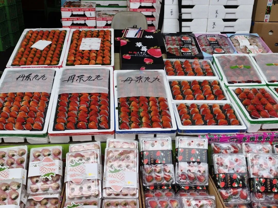 “目前草莓的品种主要是江苏徐州的奶油草莓和辽宁丹东的九九草莓。”王明峰指着档口的草莓说,“今年已经卖了20多天了,卖的很不错,今天又新到货了300多箱。”