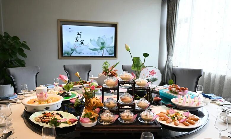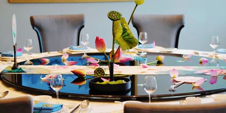 荷花宴顾名思义将荷花元素融入到食材中,用荷花、荷叶装扮点缀、辅佐入味,以及莲藕、莲子入菜,打造了一桌食色鲜香的荷花宴。用荷花的花瓣为主题铺满整个桌子,让人眼前一亮。