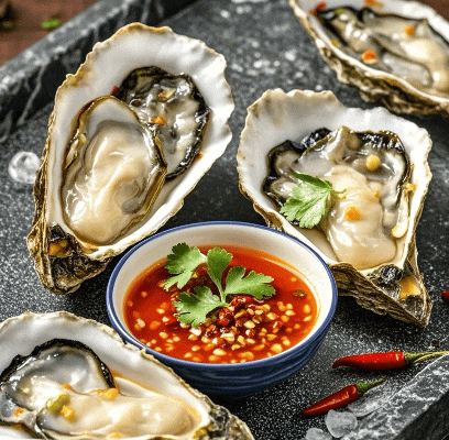 生蚝配蘸料、醋溜鱼片儿、海鲜什锦、白切牛肉蘸料汁儿……