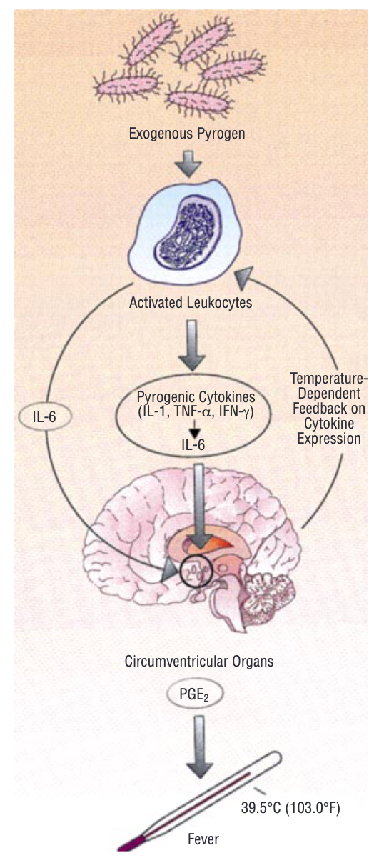 图注:发热反应的假设模型。IL代表白细胞介素;TNF代表肿瘤坏死因子;IFN代表干扰素;PGE₂代表前列腺素E₂。