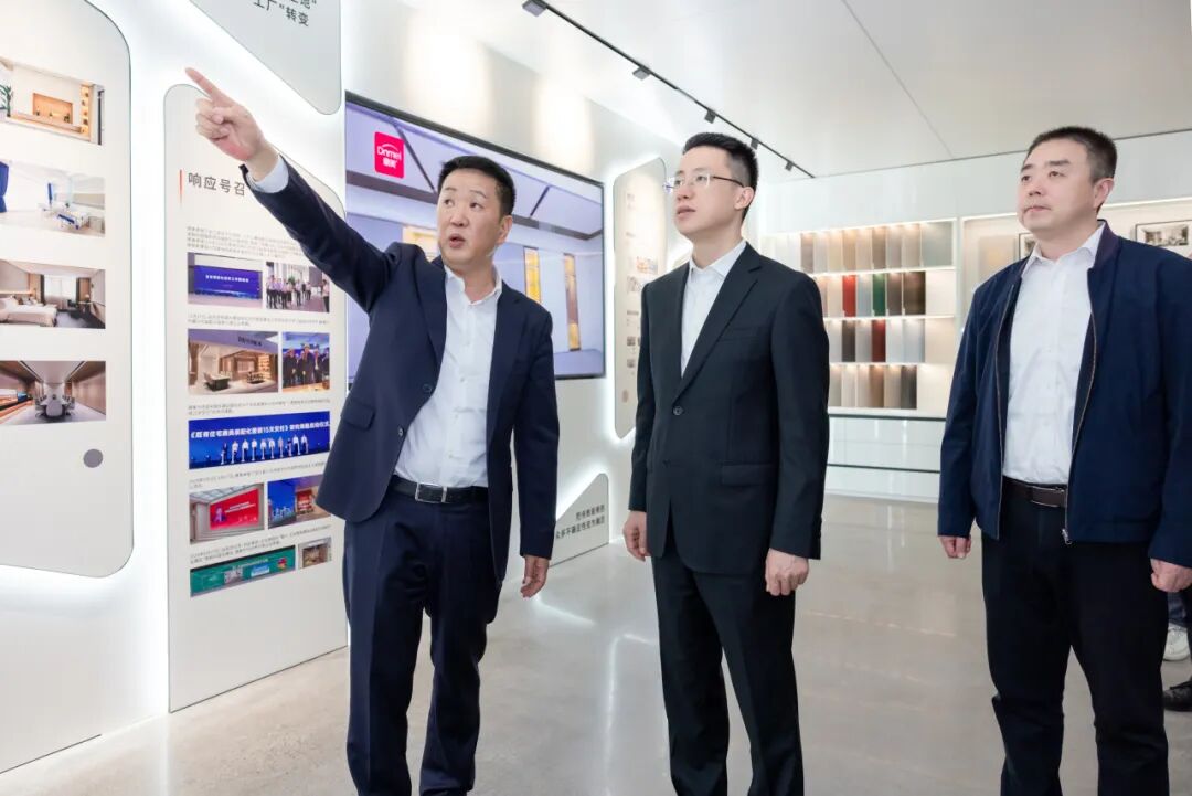 在浙江鼎美智装股份有限公司宽敞明亮的产品教室,张锡锋边走边看,听取企业负责人介绍发展历程和未来规划,就企业经营发展及核心业务、品牌打造等方面展开深入交流。公司20多年来不断创新发展,从生产单一浴霸产品到集成吊顶、顶墙集成,目前迈入装配式装修新赛道。